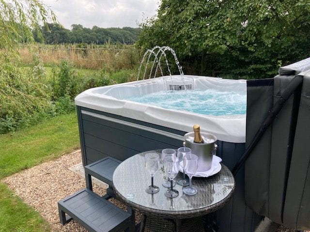 Inside, the feeling is bright, calm and intentionally simple: three spacious, ground-floor ensuite suites designed for slow starts and easy returns. Breakfast is brought to you each morning, warm and unhurried, and the details are quietly thoughtful — robes and natural toiletries, plus the simple ease of a shared guest kitchen when you’d rather keep things effortless. An optional outdoor hot tub can be booked in advance, situated in a secluded corner of the garden, with views across the seasonal flower meadow and open countryside.